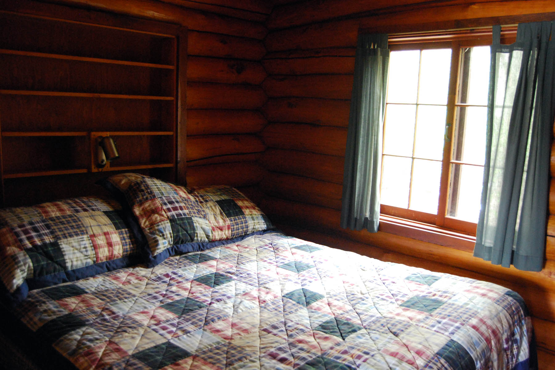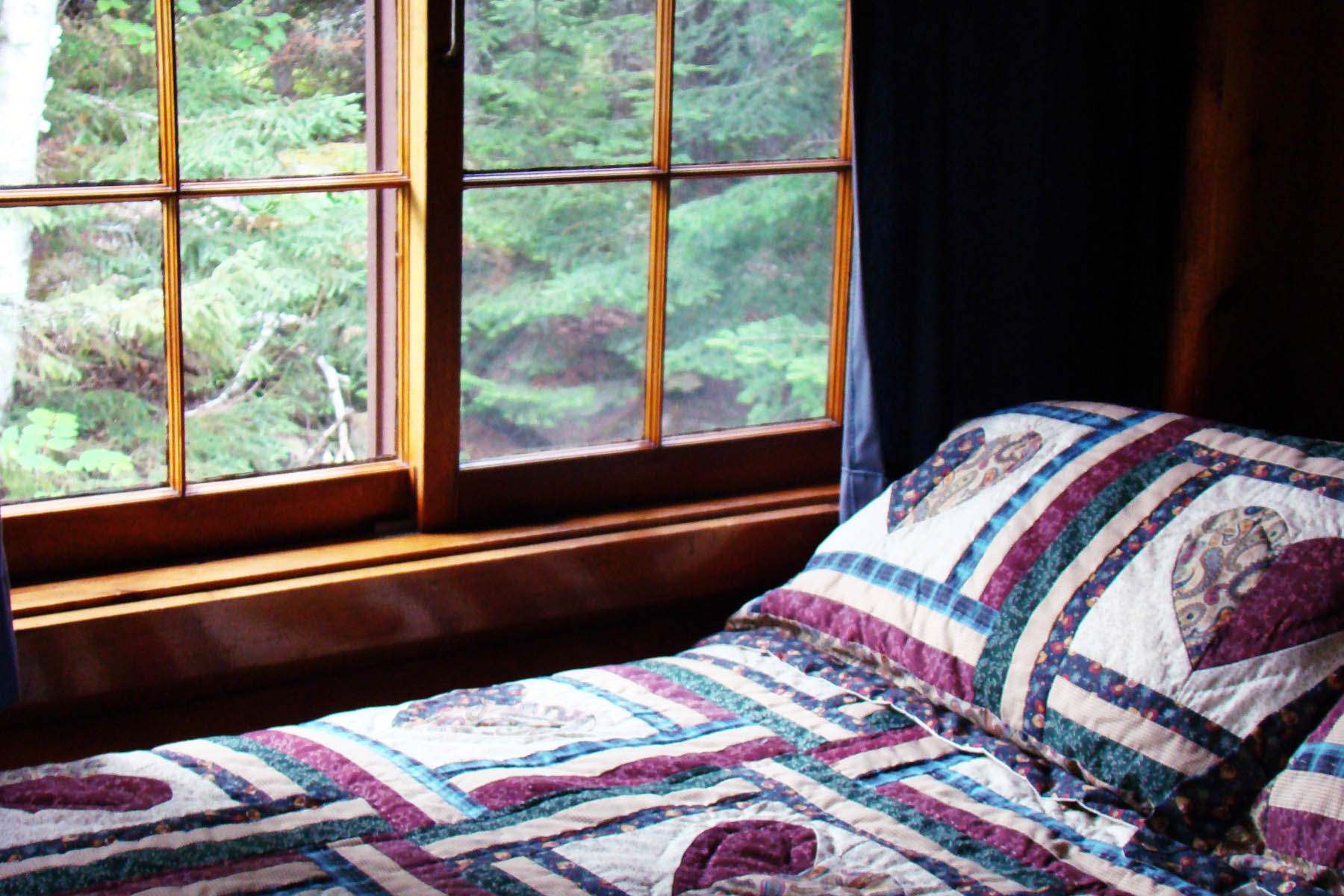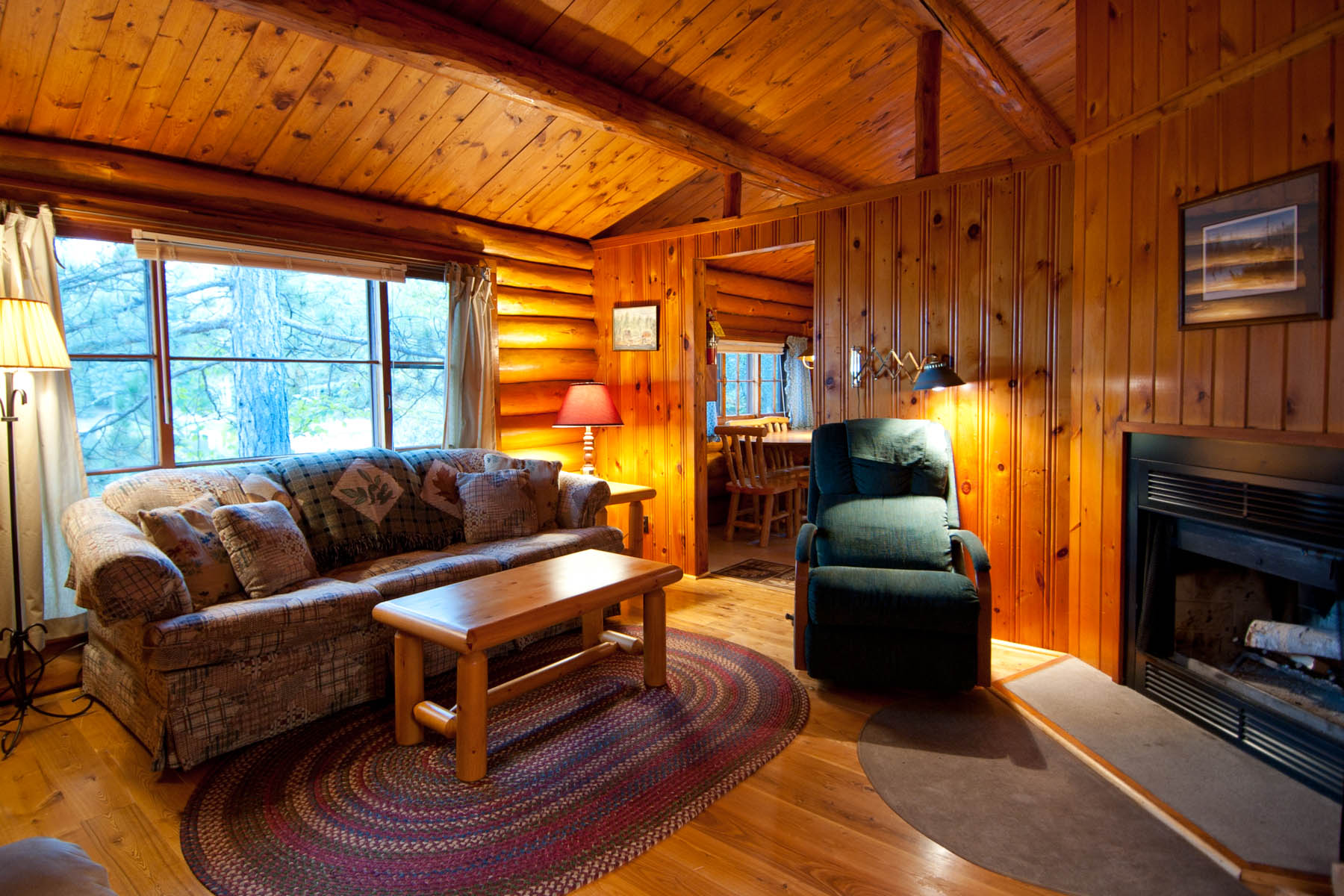 A large log cabin built in the early 1940’s as the main lodge building, Cabin Five boasts a beautiful view of the bay from both the living room and screened porch. It includes a spacious living room with a fireplace, separate large kitchen and dining area, and two bedrooms with queen beds.