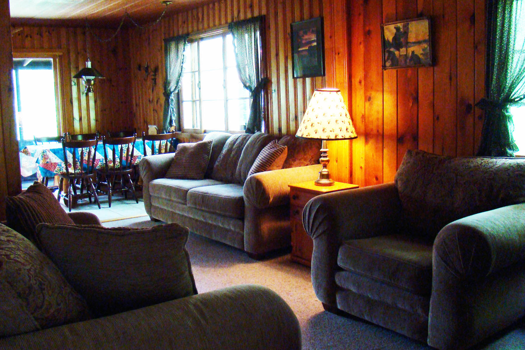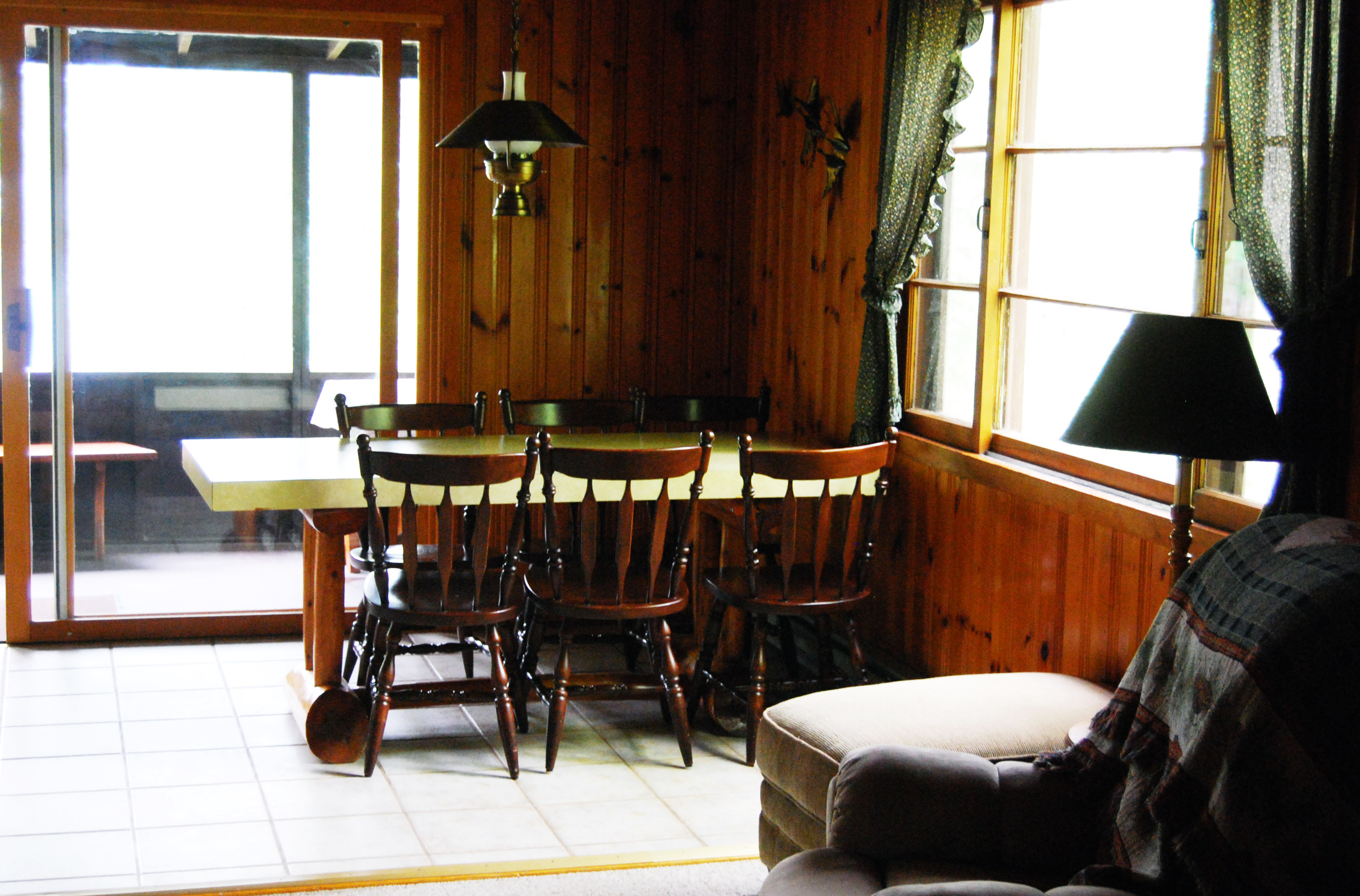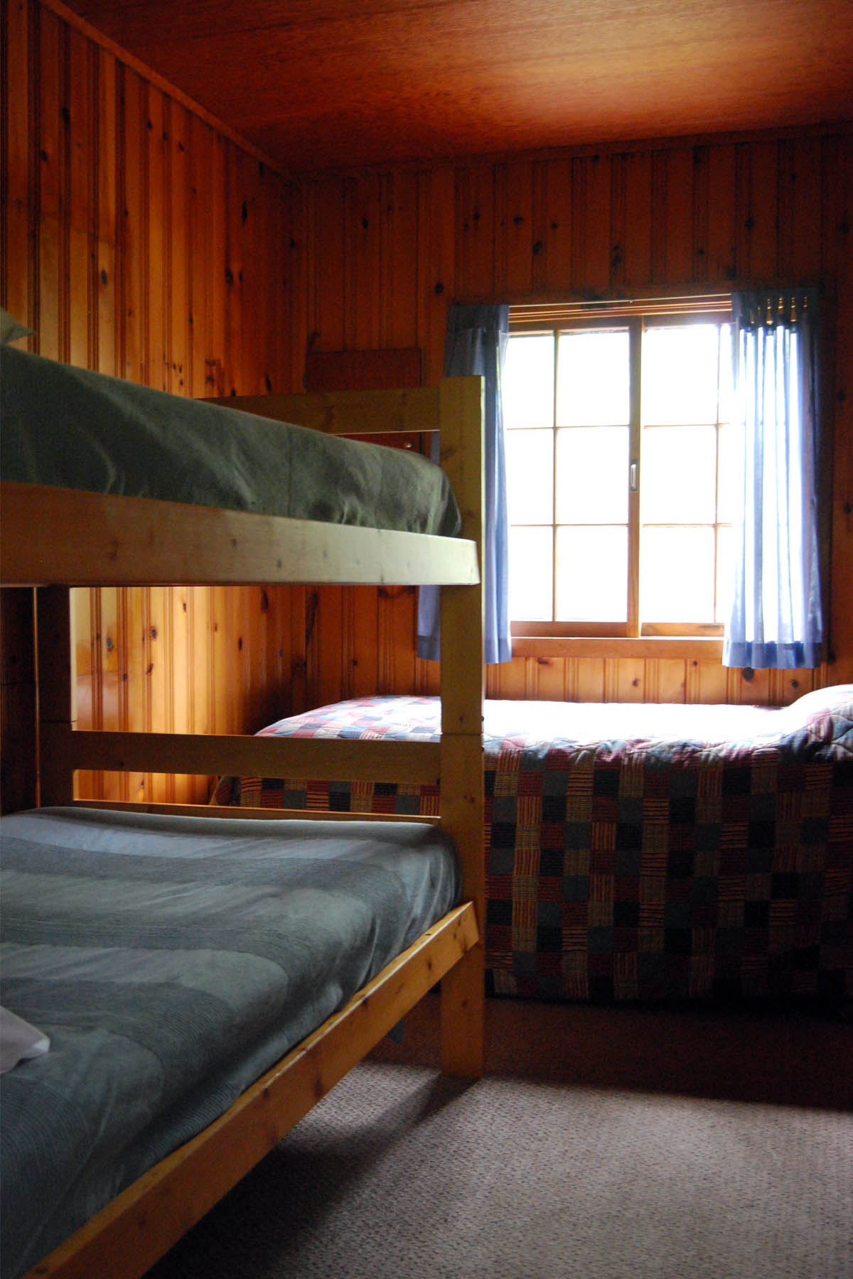 Nestled amongst the tall pines, Cabin Four sits on a rock ledge overlooking the bay. An 8’ patio door provides access to screened porch that extends across front of cabin. With a large kitchen and dining room area and a separate living room with fireplace, Cabin Four is ideal for large groups or families. It has three bedrooms-one with queen bed, one with double bed and one with a bunk and a twin bed and two bathrooms– one with a tub and one with a shower.