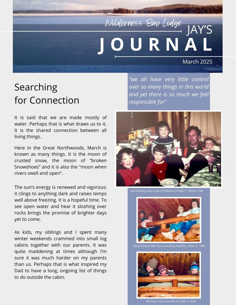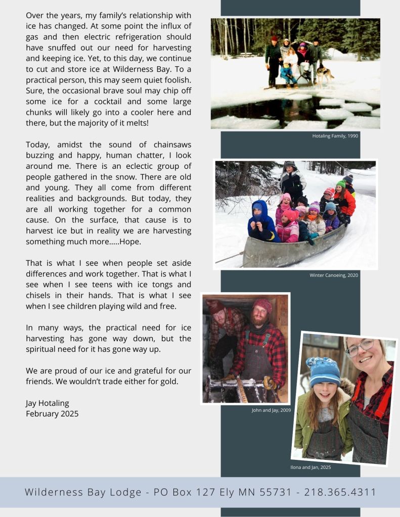 My stiffening hands work sluggishly at rigging our fishing lines as my eye catches something distant. The wolf is now trotting across the narrows and towards the distant shore. Lona is following her mom onto the island for roasting sticks as Rainy drops her tennis ball into my ice hole. Business as usual. Rainy’s ears suddenly perk towards the east as a low, mournful howl drifts down from the jackpine ridge. “Don’t worry Rainy”, I whisper with a smile, “that’s just ‘Wolfy’ saying goodbye.”